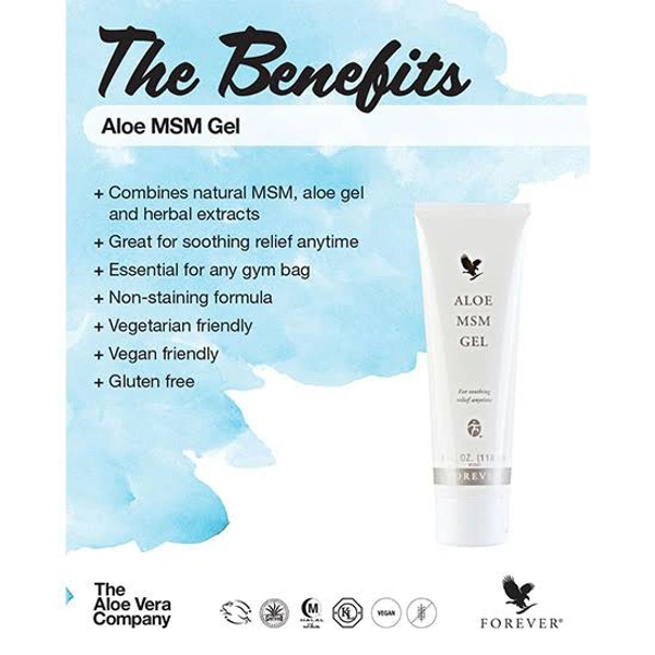 Forever’s Aloe MSM Gel is your ticket to soothing relief when and where you need it. We combined pure inner leaf aloe vera with methyl sulfonyl methane (MSM), an organic sulfur found in many living organisms. MSM has powerful skin calming properties and combined with pure aloe vera gel provides deep comfort and moisturization.