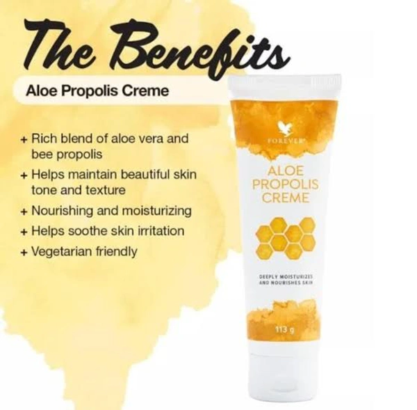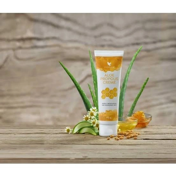 Aloe Propolis Creme combines pure inner-leaf aloe vera gel and bee propolis. Vitamins A, E and C work to nourish and moisturize the skin while propolis helps rejuvenate skin for a smoother, suppler look and feel.