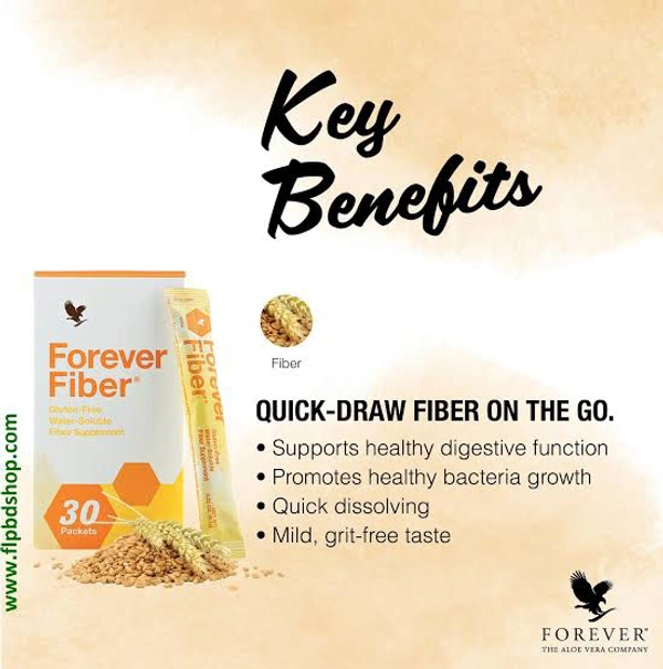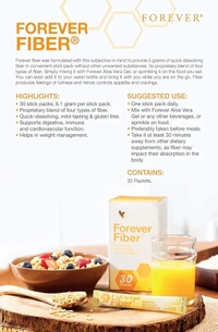Mix one packet of Forever Fiber™ with water, Forever Aloe Vera Gel®, or other beverage daily. For best results, pour contents of one packet into a glass, add your beverage of choice and mix thoroughly. You can also sprinkle on food. It is suggested to take Forever Fiber™ at least 30 minutes away from other dietary supplements as fiber may impact their absorption in the body.