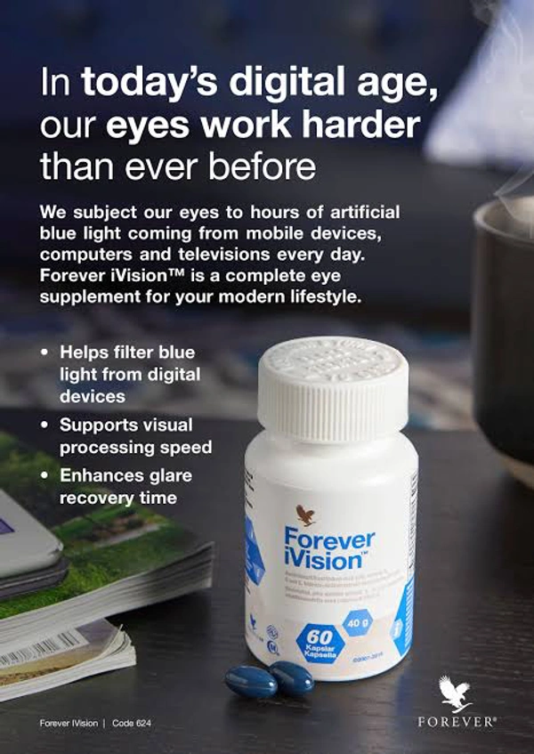 levels of eye-promoting nutrients and antioxidants. Introducing Forever iVision TM, a breakthrough supplement designed to make it easier than ever to nourish and help protect your eyes. Formulated with vitamins, antioxidant power, botanicals and scientifically-advanced ingredients, Forever iVision TM provides complete, modern day eye support.