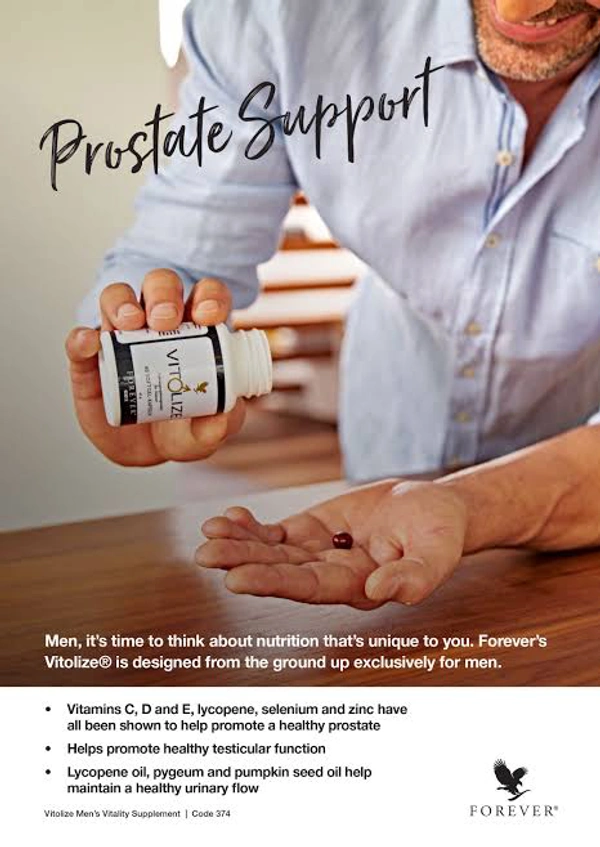 Forever’s Vit♂lize® is designed from the ground up exclusively for men. Our comprehensive formulation helps support everything from prostate health to testicular function and urinary health. This exclusive nutrient blend provides men with the perfect balance of vitamins, botanicals and minerals.